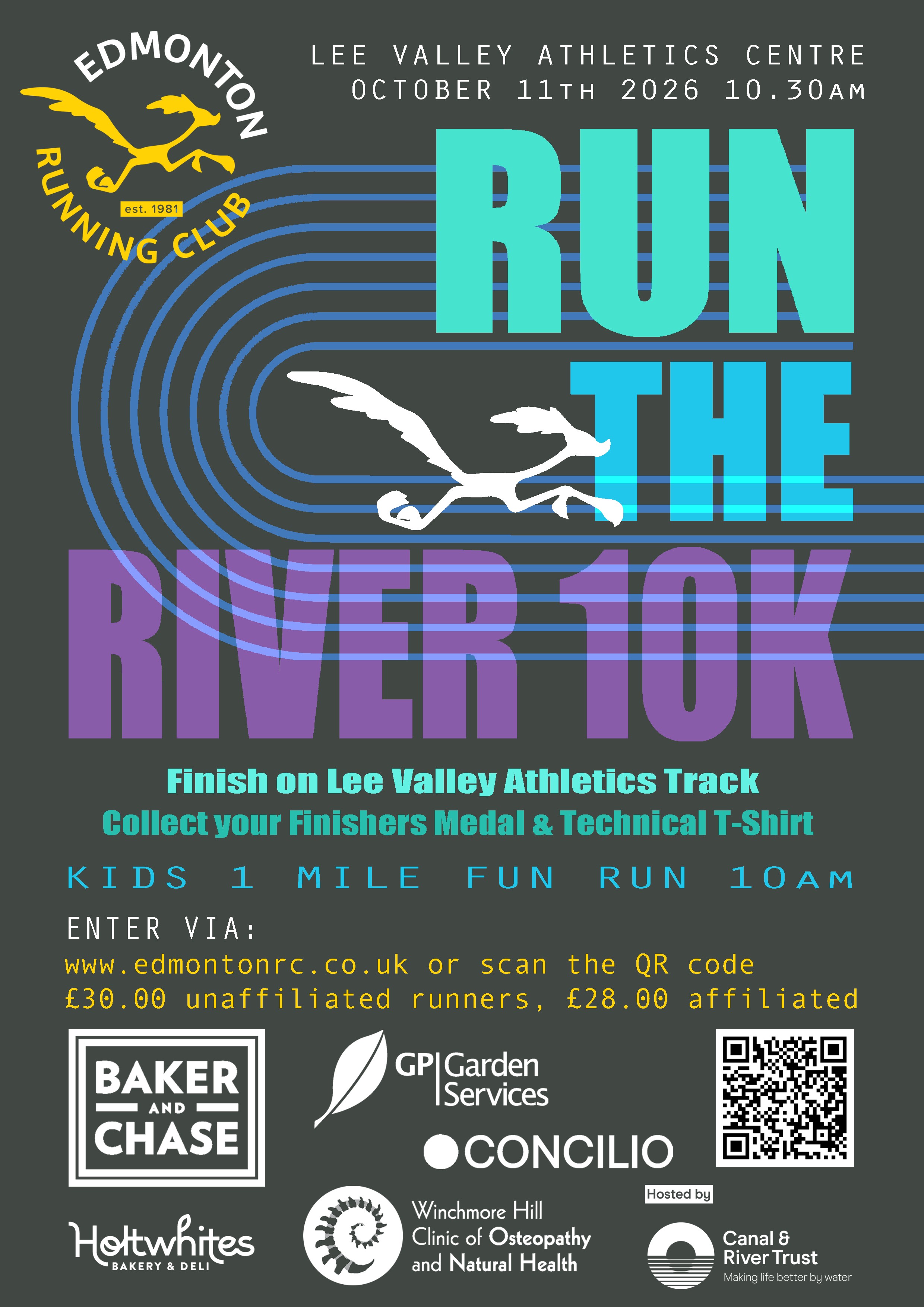 Run the River 10k is a fast, beginner-friendly off road course, starting and finishing at Lee Valley Athletics Centre, running along the River Lee. The race will start at 10:30am on 11th -Oct-2026. Entry is £30 for non affiliated runners and £28 for affiliated. All participants will receive a medal, goody bag and one of our coveted Run the River T-Shirts.